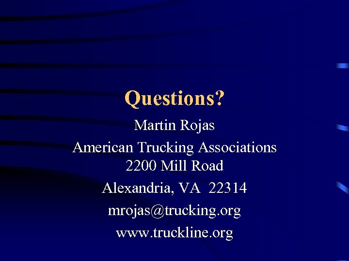 Questions? Martin Rojas American Trucking Associations 2200 Mill Road Alexandria, VA 22314 mrojas@trucking. org www. truckline. org