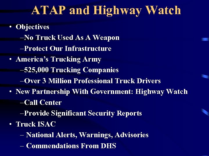 ATAP and Highway Watch • Objectives – No Truck Used As A Weapon – Protect Our Infrastructure • America’s Trucking Army – 525, 000 Trucking Companies – Over 3 Million Professional Truck Drivers • New Partnership With Government: Highway Watch – Call Center – Provide Significant Security Reports • Truck ISAC – National Alerts, Warnings, Advisories – Commendations From DHS