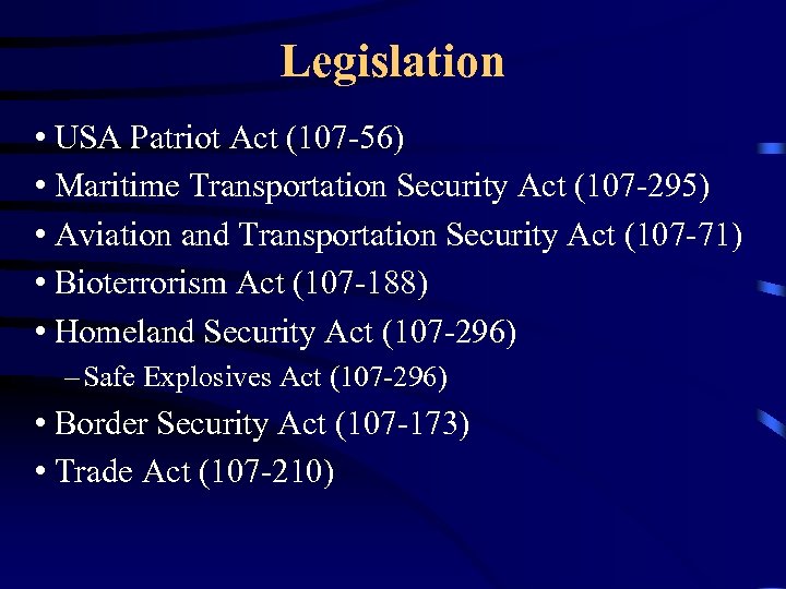 Legislation • USA Patriot Act (107 -56) • Maritime Transportation Security Act (107 -295) • Aviation and Transportation Security Act (107 -71) • Bioterrorism Act (107 -188) • Homeland Security Act (107 -296) – Safe Explosives Act (107 -296) • Border Security Act (107 -173) • Trade Act (107 -210)