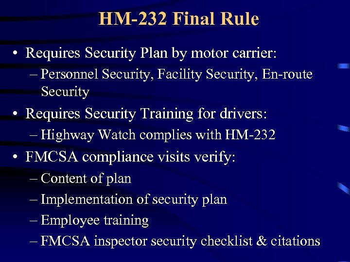 HM-232 Final Rule • Requires Security Plan by motor carrier: – Personnel Security, Facility Security, En-route Security • Requires Security Training for drivers: – Highway Watch complies with HM-232 • FMCSA compliance visits verify: – Content of plan – Implementation of security plan – Employee training – FMCSA inspector security checklist & citations