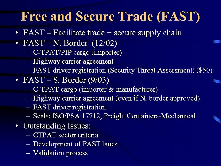 Free and Secure Trade (FAST) • FAST = Facilitate trade + secure supply chain • FAST – N. Border (12/02) – C-TPAT/PIP cargo (importer) – Highway carrier agreement – FAST driver registration (Security Threat Assessment) ($50) • FAST – S. Border (9/03) – – C-TPAT cargo (importer & manufacturer) Highway carrier agreement (even if N. border approved) FAST driver registration Seals: ISO/PSA 17712, Freight Containers-Mechanical • Outstanding Issues: – CTPAT sector criteria – Development of FAST lanes – Validation process