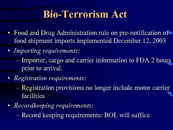 Bio-Terrorism Act • Food and Drug Administration rule on pre-notification of food shipment imports implemented December 12, 2003 • Importing requirements: – Importer, cargo and carrier information to FDA 2 hours prior to arrival. • Registration requirements: – Registration provisions no longer include motor carrier facilities • Recordkeeping requirements: – Record keeping requirements: BOL will suffice