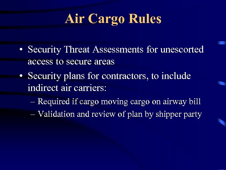 Air Cargo Rules • Security Threat Assessments for unescorted access to secure areas • Security plans for contractors, to include indirect air carriers: – Required if cargo moving cargo on airway bill – Validation and review of plan by shipper party