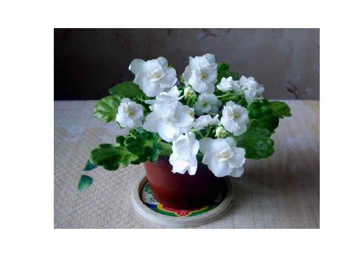 Фиалка • Фиалка является одним из самых популярных комнатных растений. Существует огромное количество разновидностей фиалок или как их называют «сенполий» . Можно выбрать себе практически любой сорт под нужный размер и цвет. Это компактные растения, способные цвести почти круглый год. Фиалка, латинское - Saintpaulia, народное — брат-и-сестра. • В Европе фиалка появилась в 19 веке. Родом комнатная фиалка из Восточной Африки, растет в джунглях. На своей родине сенполии — это многолетнее травянистое растение вырастает до 30 см и насчитывает два десятка видов. Сенполию в комнатном цветоводстве любят за небольшие габариты и длительное (до 10 месяцев в году) цветение. • Фиалки имеют овальные (иногда чуть удлинённые листья). Края листьев гладкие или с зазубринами, собраны в прикорневую розетку. Цвет листьев может быть тёмно или светло зелёным. Цветы простые или махровые от 2 -х до 4 -х см в диаметре, имеют окраску от фиолетовой, синей, красной до чисто белой.