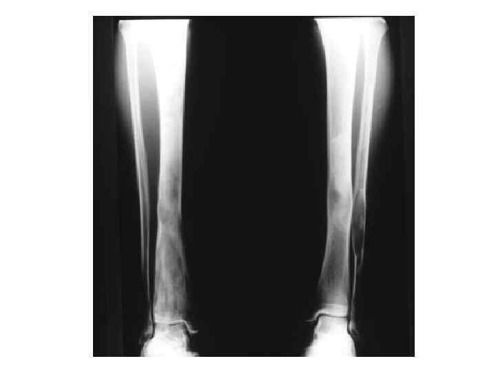 На рентгенограмме обеих голеней в задней проекции определяется умеренно выраженная деформация костей обеих голеней, больше справа за счет наличия в их структуре распространенных, расположенных преимущественно в диафизах костей , неправильной формы образований литического характера с признаками слияния их между собой, с неоднородной внутренней структурой, не содержащей, впрочем, известковых включений или ячеистых изменений. Кортикальный слой кости неравномерно истончен, но сохранен на всем протяжении. Периостальных изменений , уплотнения или увеличения объема мягких тканей не отмечается. • Заключение: Картина фиброзной дисплазии, полиоссальная форма. Для уточнения – трепанбиопсия. •