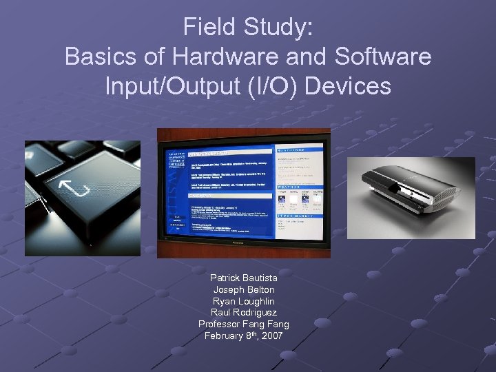 Field Study: Basics of Hardware and Software Input/Output (I/O) Devices Patrick Bautista Joseph Belton Ryan Loughlin Raul Rodriguez Professor Fang February 8 th, 2007