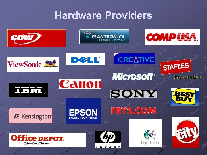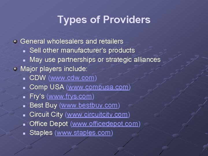 Types of Providers General wholesalers and retailers n Sell other manufacturer’s products n May use partnerships or strategic alliances Major players include: n CDW (www. cdw. com) n Comp USA (www. compusa. com) n Fry’s (www. frys. com) n Best Buy (www. bestbuy. com) n Circuit City (www. circuitcity. com) n Office Depot (www. officedepot. com) n Staples (www. staples. com)