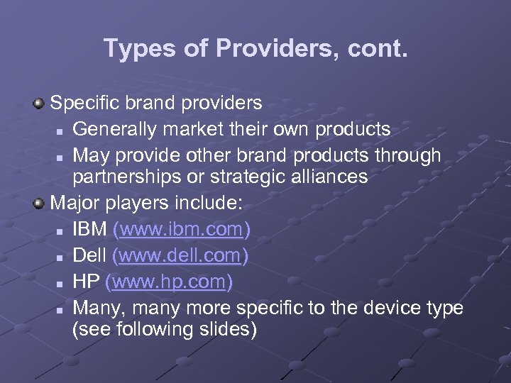 Types of Providers, cont. Specific brand providers n Generally market their own products n May provide other brand products through partnerships or strategic alliances Major players include: n IBM (www. ibm. com) n Dell (www. dell. com) n HP (www. hp. com) n Many, many more specific to the device type (see following slides)