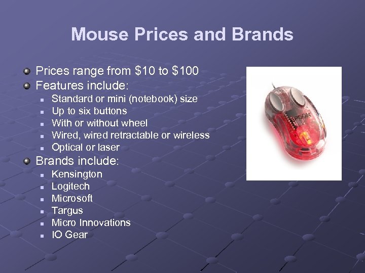 Mouse Prices and Brands Prices range from $10 to $100 Features include: n n n Standard or mini (notebook) size Up to six buttons With or without wheel Wired, wired retractable or wireless Optical or laser Brands include: n n n Kensington Logitech Microsoft Targus Micro Innovations IO Gear
