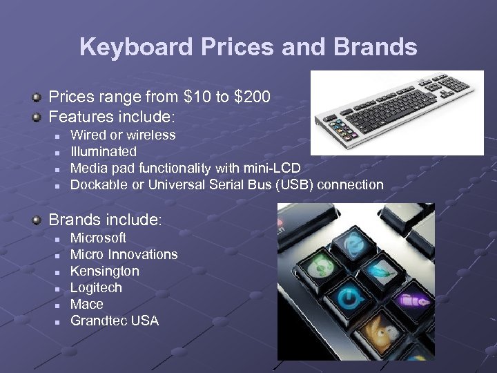 Keyboard Prices and Brands Prices range from $10 to $200 Features include: n n Wired or wireless Illuminated Media pad functionality with mini-LCD Dockable or Universal Serial Bus (USB) connection Brands include: n n n Microsoft Micro Innovations Kensington Logitech Mace Grandtec USA