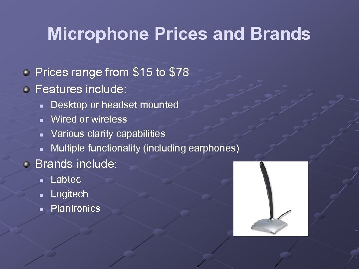 Microphone Prices and Brands Prices range from $15 to $78 Features include: n n Desktop or headset mounted Wired or wireless Various clarity capabilities Multiple functionality (including earphones) Brands include: n n n Labtec Logitech Plantronics