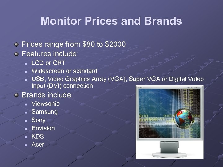 Monitor Prices and Brands Prices range from $80 to $2000 Features include: n n n LCD or CRT Widescreen or standard USB, Video Graphics Array (VGA), Super VGA or Digital Video Input (DVI) connection Brands include: n n n Viewsonic Samsung Sony Envision KDS Acer