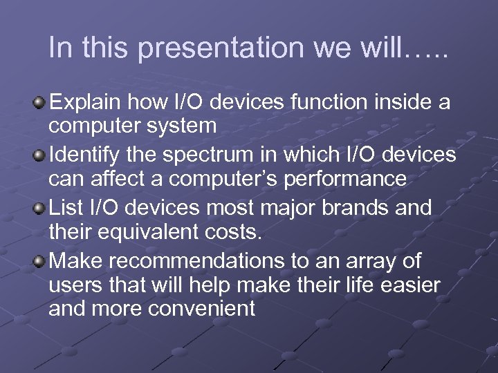 In this presentation we will…. . Explain how I/O devices function inside a computer system Identify the spectrum in which I/O devices can affect a computer’s performance List I/O devices most major brands and their equivalent costs. Make recommendations to an array of users that will help make their life easier and more convenient