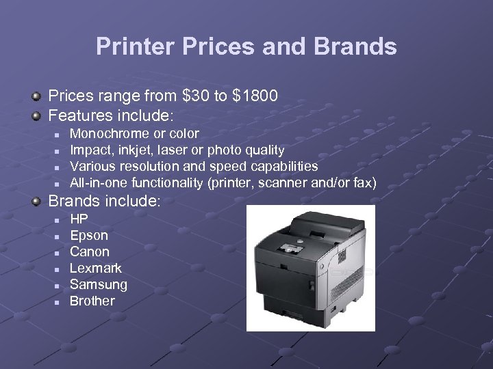 Printer Prices and Brands Prices range from $30 to $1800 Features include: n n Monochrome or color Impact, inkjet, laser or photo quality Various resolution and speed capabilities All-in-one functionality (printer, scanner and/or fax) Brands include: n n n HP Epson Canon Lexmark Samsung Brother