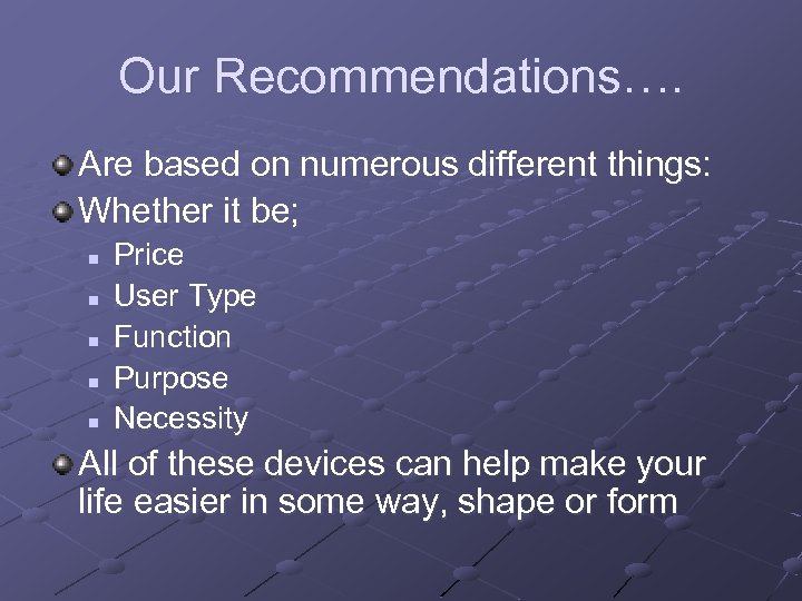 Our Recommendations…. Are based on numerous different things: Whether it be; n n n Price User Type Function Purpose Necessity All of these devices can help make your life easier in some way, shape or form