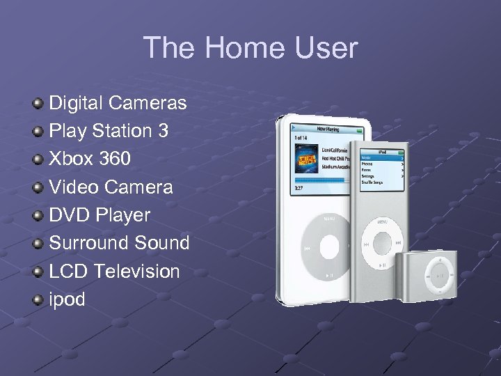 The Home User Digital Cameras Play Station 3 Xbox 360 Video Camera DVD Player Surround Sound LCD Television ipod