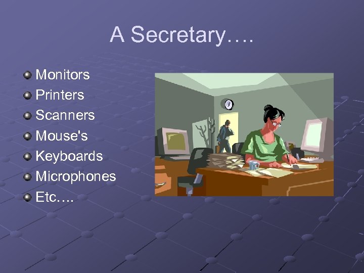 A Secretary…. Monitors Printers Scanners Mouse's Keyboards Microphones Etc….