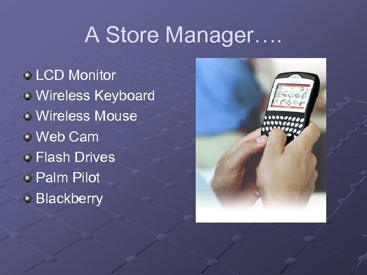 A Store Manager…. LCD Monitor Wireless Keyboard Wireless Mouse Web Cam Flash Drives Palm Pilot Blackberry