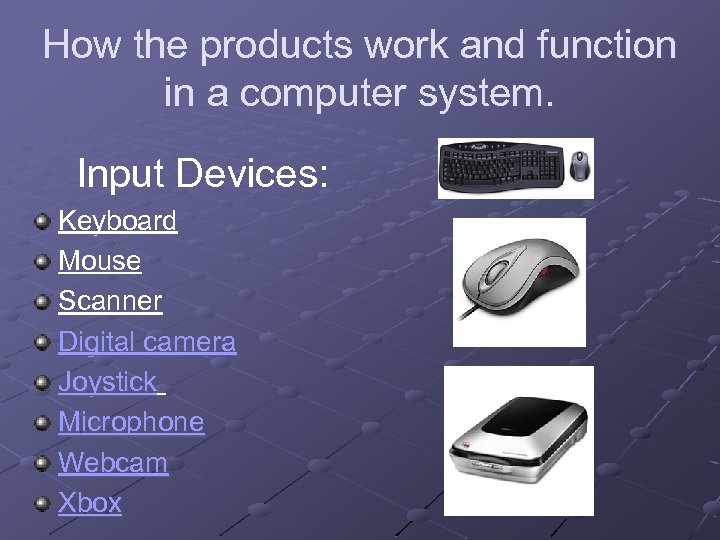 How the products work and function in a computer system. Input Devices: Keyboard Mouse Scanner Digital camera Joystick Microphone Webcam Xbox