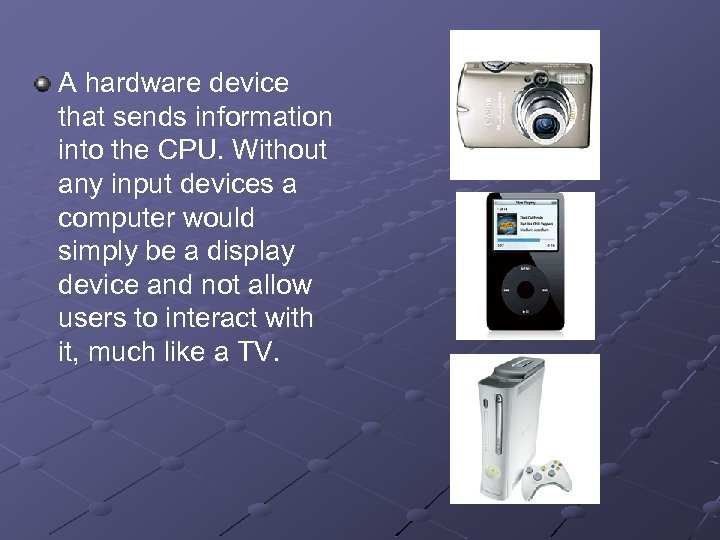 A hardware device that sends information into the CPU. Without any input devices a computer would simply be a display device and not allow users to interact with it, much like a TV.
