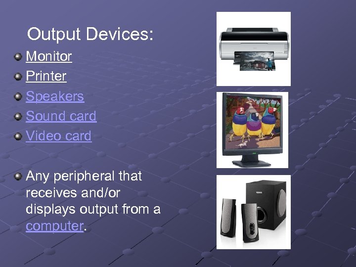Output Devices: Monitor Printer Speakers Sound card Video card Any peripheral that receives and/or displays output from a computer.