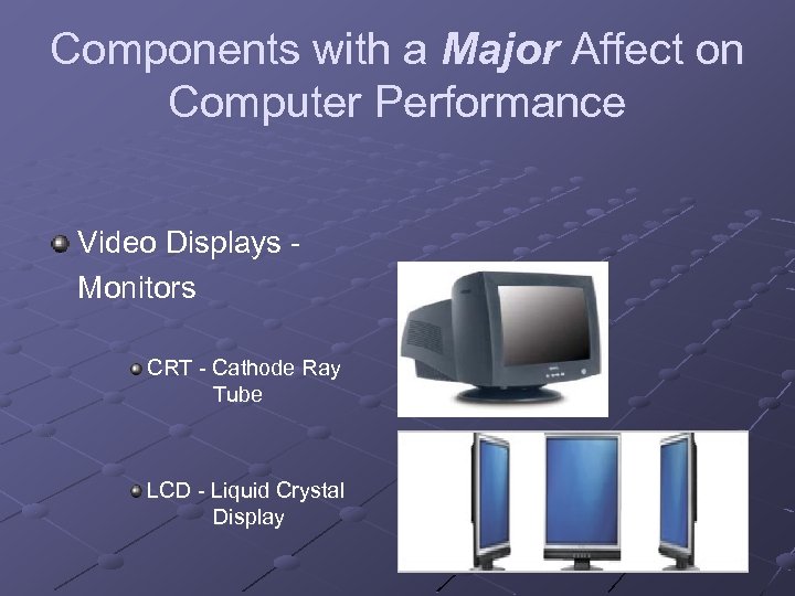 Components with a Major Affect on Computer Performance Video Displays Monitors CRT - Cathode Ray Tube LCD - Liquid Crystal Display