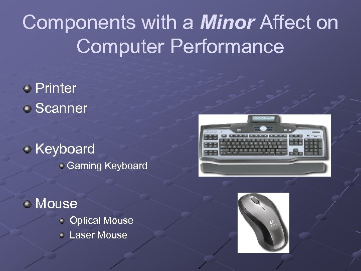 Components with a Minor Affect on Computer Performance Printer Scanner Keyboard Gaming Keyboard Mouse Optical Mouse Laser Mouse