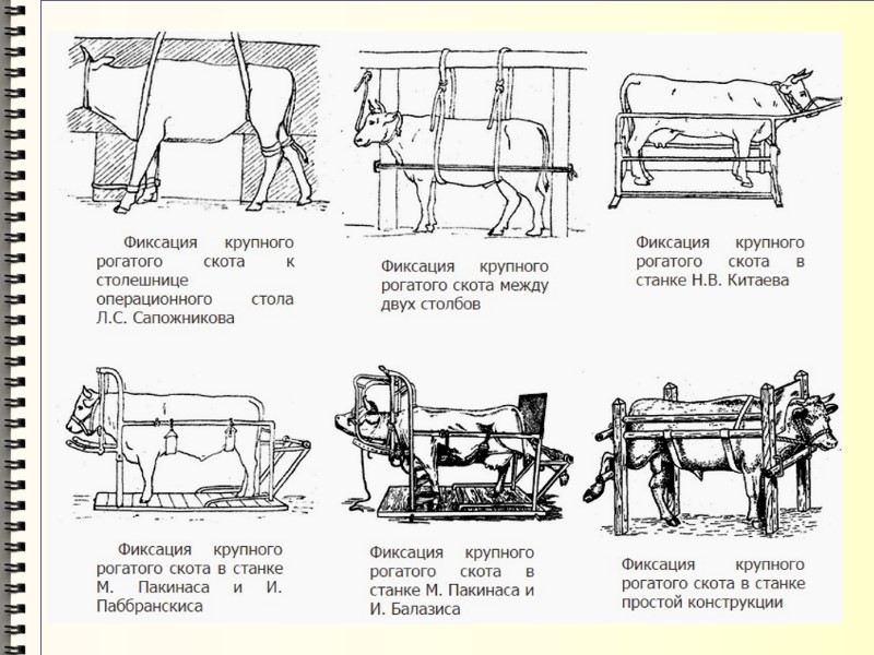 Фиксация животных Животным легко возбудимым и злым, наряду с фиксацией, назначают успокаивающие или снотворные средства. Способы фиксации многочисленны и крайне разнообразны. Выбор их зависит от вида животного, характера операции и состояния больного животного.