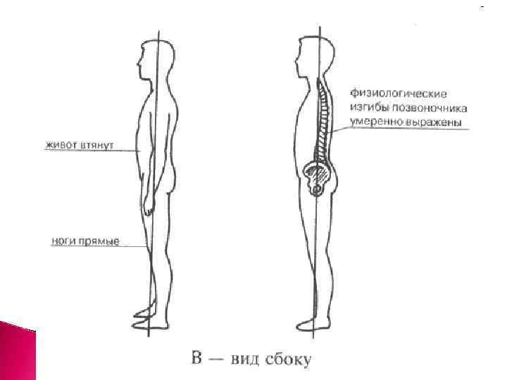 Признаки правильной осанки: голова приподнята; грудная клетка развернута; плечи - на одном уровне; если смотреть сзади, голова, шея и позвоночник составляют прямую вертикальную линию; если смотреть сбоку, позвоночник имеет небольшие углубления в шейном и поясничном отделах (лордозы) и небольшую выпуклость в грудном отделе (кифоз).