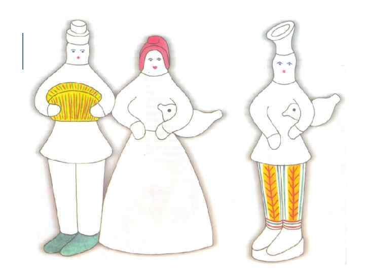 ОРНАМЕНТ ФИЛИМОНОВСКИХ ИГРУШЕК Роспись выполняется красителями, растертыми на яичном желтке или белке, куриным пером. Использовали три главные цвета — малиново-красный, желтый и зеленый. Иногда применяли синий или фиолетовый цвета. Каждому персонажу — свой цвет. Из-за того что роспись велась пером, она кажется небрежной, неумелой, словно это детская работа.