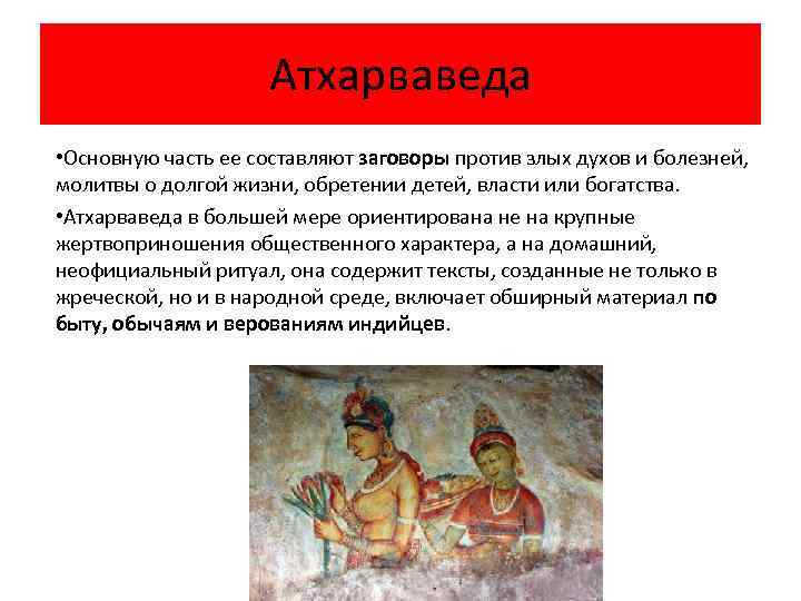 Атхарваведа • Основную часть ее составляют заговоры против злых духов и болезней, молитвы о долгой жизни, обретении детей, власти или богатства. • Атхарваведа в большей мере ориентирована не на крупные жертвоприношения общественного характера, а на домашний, неофициальный ритуал, она содержит тексты, созданные не только в жреческой, но и в народной среде, включает обширный материал по быту, обычаям и верованиям индийцев.