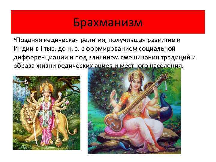 Брахманизм • Поздняя ведическая религия, получившая развитие в Индии в I тыс. до н. э. с формированием социальной дифференциации и под влиянием смешивания традиций и образа жизни ведических ариев и местного населения.