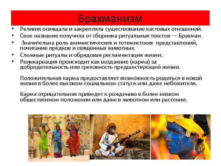 Брахманизм • Религия освящала и закрепляла существование кастовых отношений. • Свое название получила от сборника ритуальных текстов — Брахман. • Значительна роль анимистических и тотемистских представлений, почитание предков и священных животных. • Сложные ритуалы и обрядовая регламентация жизни. • Реинкарнация происходит как воздаяние (карма) за добродетельность или греховность предшествующей жизни. Положительная карма предоставляет возможность родиться в новой жизни в более высоком социальном статусе или даже небожителя. Карма отрицательная приведет к рождению в более низком общественном положении или даже в животном или растении.
