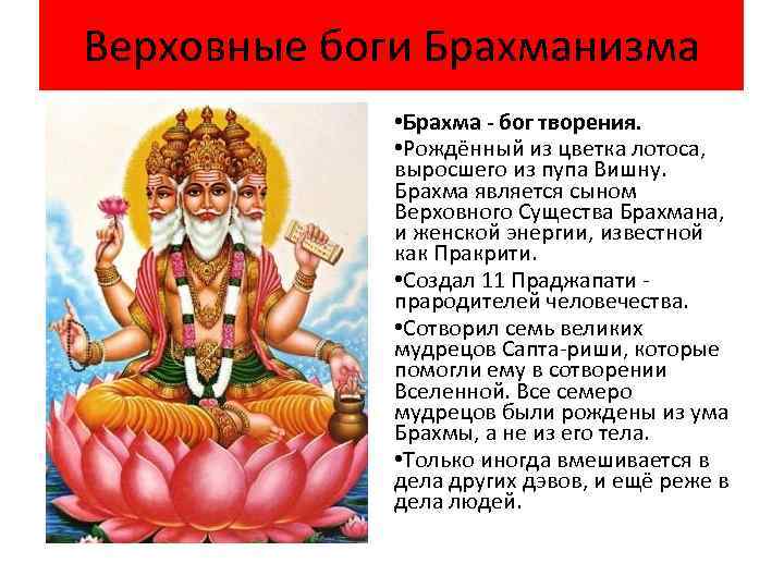 Верховные боги Брахманизма • Брахма - бог творения. • Рождённый из цветка лотоса, выросшего из пупа Вишну. Брахма является сыном Верховного Существа Брахмана, и женской энергии, известной как Пракрити. • Создал 11 Праджапати - прародителей человечества. • Сотворил семь великих мудрецов Сапта-риши, которые помогли ему в сотворении Вселенной. Все семеро мудрецов были рождены из ума Брахмы, а не из его тела. • Только иногда вмешивается в дела других дэвов, и ещё реже в дела людей.