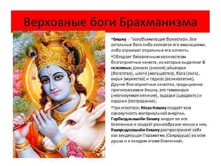 Верховные боги Брахманизма • Вишну - "всеобъемлющее божество» . Все остальные боги либо являются его эманациями, либо отражают отдельные его аспекты. • Обладает бесконечным количеством благоприятных качеств, из которых выделяют 6 основных: джнана (знание), айшварья (богатство), шакти (могущество), бала (сила), вирья (мужество) и теджас (великолепие). Другие благоприятные качества, традиционно приписываемые Вишну, это гамюхирья (неописуемое величие), аударья (щедрость) и карунья (сострадание). • Три ипостаси. Маха-Вишну создаёт всю совокупность материальной энергии. Гарбходакашайи Вишну входит во все Вселенные и создаёт разнообразие жизни в них. Кширодакашайи Вишну распространяет себя как вездесущая Параматма (Сверхдуша) во всех душах и в каждом атоме Вселенной.