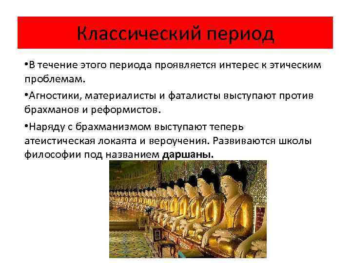 Классический период • В течение этого периода проявляется интерес к этическим проблемам. • Агностики, материалисты и фаталисты выступают против брахманов и реформистов. • Наряду с брахманизмом выступают теперь атеистическая локаята и вероучения. Развиваются школы философии под названием даршаны.