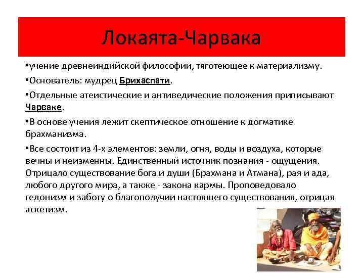 Локаята-Чарвака • учение древнеиндийской философии, тяготеющее к материализму. • Основатель: мудрец Брихаспати. • Отдельные атеистические и антиведические положения приписывают Чарваке. • В основе учения лежит скептическое отношение к догматике брахманизма. • Все состоит из 4 -х элементов: земли, огня, воды и воздуха, которые вечны и неизменны. Единственный источник познания - ощущения. Отрицало существование бога и души (Брахмана и Атмана), рая и ада, любого другого мира, а также - закона кармы. Проповедовало гедонизм и заботу о благополучии настоящего существования, отрицая аскетизм.