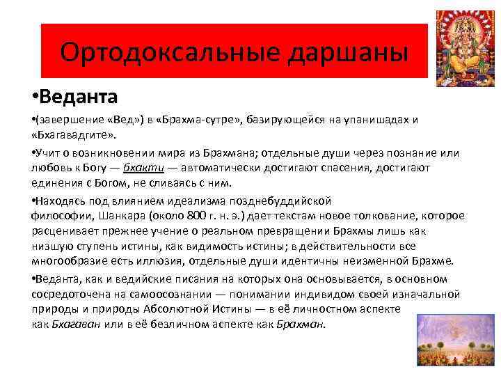 Ортодоксальные даршаны • Веданта • (завершение «Вед» ) в «Брахма-сутре» , базирующейся на упанишадах и «Бхагавадгите» . • Учит о возникновении мира из Брахмана; отдельные души через познание или любовь к Богу — бхакти — автоматически достигают спасения, достигают единения с Богом, не сливаясь с ним. • Находясь под влиянием идеализма позднебуддийской философии, Шанкара (около 800 г. н. э. ) дает текстам новое толкование, которое расценивает прежнее учение о реальном превращении Брахмы лишь как низшую ступень истины, как видимость истины; в действительности все многообразие есть иллюзия, отдельные души идентичны неизменной Брахме. • Веданта, как и ведийские писания на которых она основывается, в основном сосредоточена на самоосознании — понимании индивидом своей изначальной природы и природы Абсолютной Истины — в её личностном аспекте как Бхагаван или в её безличном аспекте как Брахман.