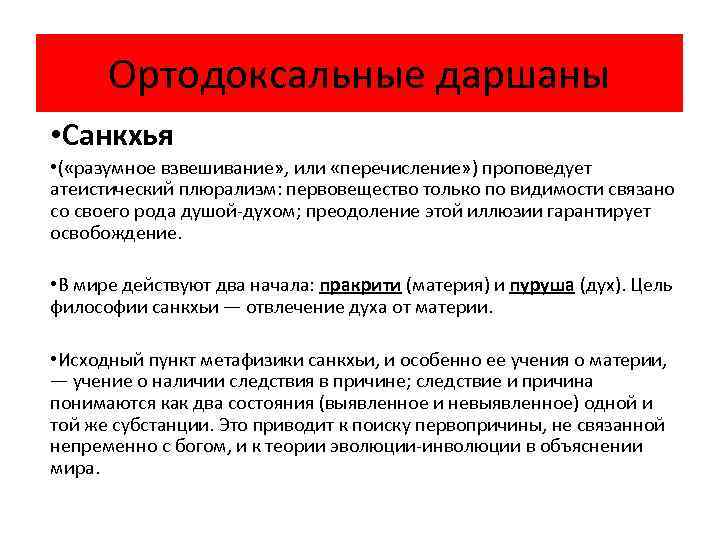 Ортодоксальные даршаны • Санкхья • ( «разумное взвешивание» , или «перечисление» ) проповедует атеистический плюрализм: первовещество только по видимости связано со своего рода душой-духом; преодоление этой иллюзии гарантирует освобождение. • В мире действуют два начала: пракрити (материя) и пуруша (дух). Цель философии санкхьи — отвлечение духа от материи. • Исходный пункт метафизики санкхьи, и особенно ее учения о материи, — учение о наличии следствия в причине; следствие и причина понимаются как два состояния (выявленное и невыявленное) одной и той же субстанции. Это приводит к поиску первопричины, не связанной непременно с богом, и к теории эволюции-инволюции в объяснении мира.