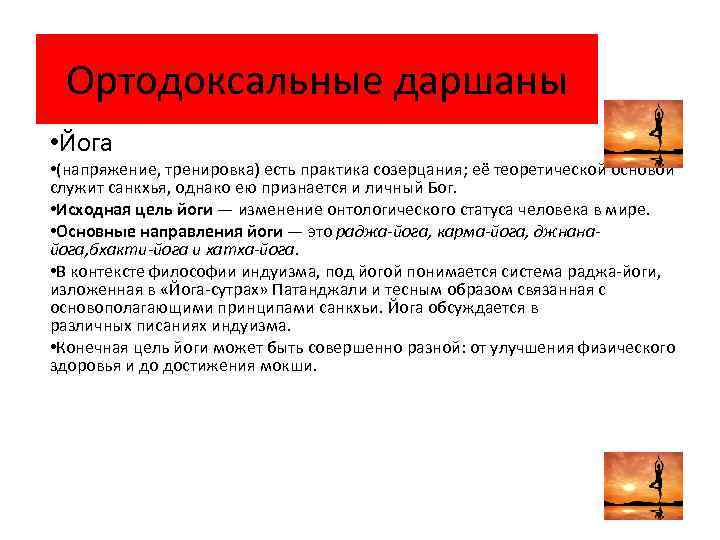 Ортодоксальные даршаны • Йога • (напряжение, тренировка) есть практика созерцания; её теоретической основой служит санкхья, однако ею признается и личный Бог. • Исходная цель йоги — изменение онтологического статуса человека в мире. • Основные направления йоги — это раджа-йога, карма-йога, джнанайога, бхакти-йога и хатха-йога. • В контексте философии индуизма, под йогой понимается система раджа-йоги, изложенная в «Йога-сутрах» Патанджали и тесным образом связанная с основополагающими принципами санкхьи. Йога обсуждается в различных писаниях индуизма. • Конечная цель йоги может быть совершенно разной: от улучшения физического здоровья и до достижения мокши.