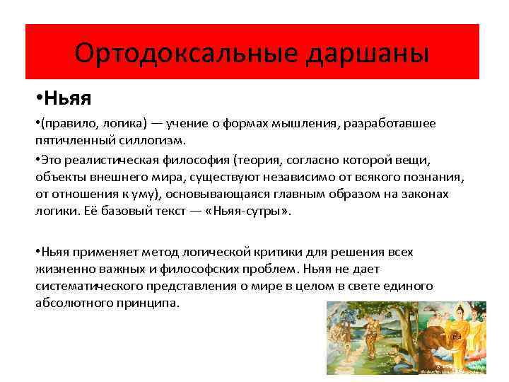 Ортодоксальные даршаны • Ньяя • (правило, логика) — учение о формах мышления, разработавшее пятичленный силлогизм. • Это реалистическая философия (теория, согласно которой вещи, объекты внешнего мира, существуют независимо от всякого познания, от отношения к уму), основывающаяся главным образом на законах логики. Её базовый текст — «Ньяя-сутры» . • Ньяя применяет метод логической критики для решения всех жизненно важных и философских проблем. Ньяя не дает систематического представления о мире в целом в свете единого абсолютного принципа.
