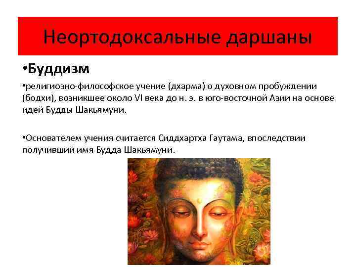 Неортодоксальные даршаны • Буддизм • религиозно-философское учение (дхарма) о духовном пробуждении (бодхи), возникшее около VI века до н. э. в юго-восточной Азии на основе идей Будды Шакьямуни. • Основателем учения считается Сиддхартха Гаутама, впоследствии получивший имя Будда Шакьямуни.