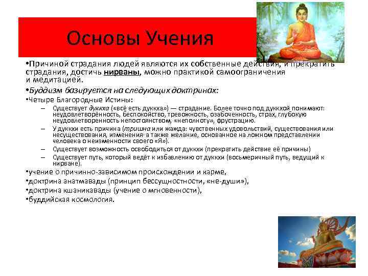 Основы Учения • Причиной страдания людей являются их собственные действия, и прекратить страдания, достичь нирваны, можно практикой самоограничения и медитацией. • Буддизм базируется на следующих доктринах: • Четыре Благородные Истины: – Существует дуккха ( «всё есть дуккха» ) — страдание. Более точно под дуккхой понимают: неудовлетворённость, беспокойство, тревожность, озабоченность, страх, глубокую неудовлетворенность непостоянством, «неполноту» , фрустрацию. – У дуккхи есть причина (тришна или жажда: чувственных удовольствий, существования или несуществования, изменения, а также желание, основанное на ложном представлении человека о неизменности своего «Я» ). – Существует возможность освободиться от дуккхи (прекратить действие её причины) – Существует путь, который ведёт к избавлению от дуккхи (восьмеричный путь, ведущий к нирване). • учение о причинно-зависимом происхождении и карме, • доктрина анатмавады (принцип бессущности, «не-души» ), • доктрина кшаникавады (учение о мгновенности), • буддийская космология.