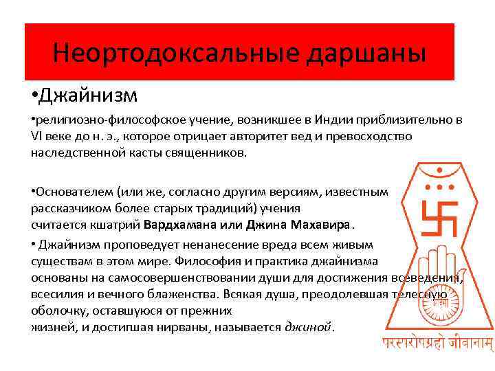 Неортодоксальные даршаны • Джайнизм • религиозно-философское учение, возникшее в Индии приблизительно в VI веке до н. э. , которое отрицает авторитет вед и превосходство наследственной касты священников. • Основателем (или же, согласно другим версиям, известным рассказчиком более старых традиций) учения считается кшатрий Вардхамана или Джина Махавира. • Джайнизм проповедует ненанесение вреда всем живым существам в этом мире. Философия и практика джайнизма основаны на самосовершенствовании души для достижения всеведения, всесилия и вечного блаженства. Всякая душа, преодолевшая телесную оболочку, оставшуюся от прежних жизней, и достигшая нирваны, называется джиной.