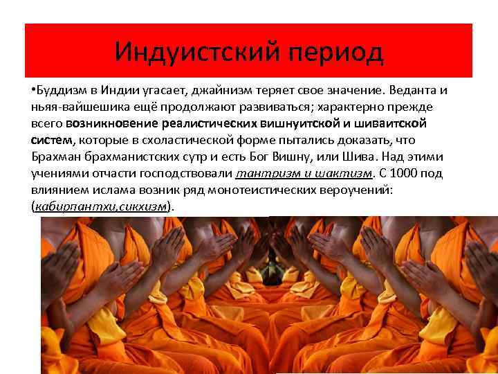 Индуистский период • Буддизм в Индии угасает, джайнизм теряет свое значение. Веданта и ньяя-вайшешика ещё продолжают развиваться; характерно прежде всего возникновение реалистических вишнуитской и шиваитской систем, которые в схоластической форме пытались доказать, что Брахман брахманистских сутр и есть Бог Вишну, или Шива. Над этими учениями отчасти господствовали тантризм и шактизм. С 1000 под влиянием ислама возник ряд монотеистических вероучений: (кабирпантхи, сикхизм).