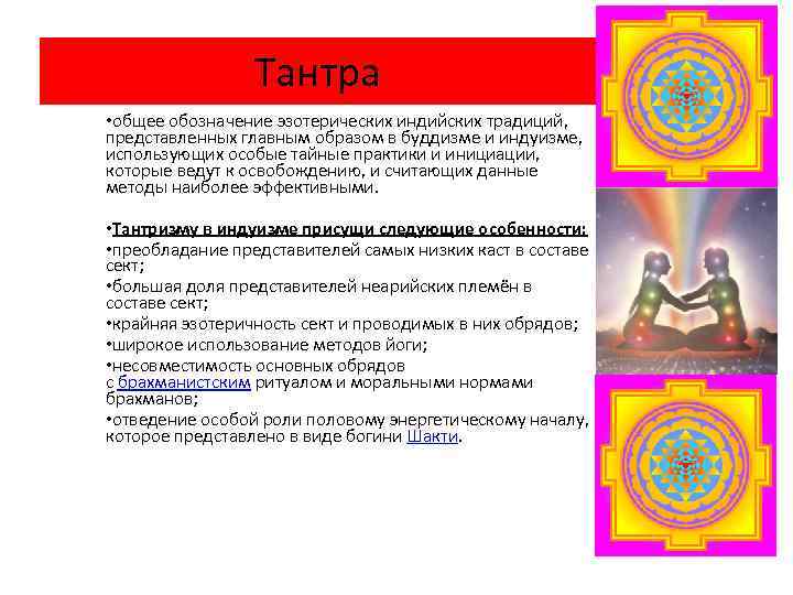 Тантра • общее обозначение эзотерических индийских традиций, представленных главным образом в буддизме и индуизме, использующих особые тайные практики и инициации, которые ведут к освобождению, и считающих данные методы наиболее эффективными. • Тантризму в индуизме присущи следующие особенности: • преобладание представителей самых низких каст в составе сект; • большая доля представителей неарийских племён в составе сект; • крайняя эзотеричность сект и проводимых в них обрядов; • широкое использование методов йоги; • несовместимость основных обрядов с брахманистским ритуалом и моральными нормами брахманов; • отведение особой роли половому энергетическому началу, которое представлено в виде богини Шакти.