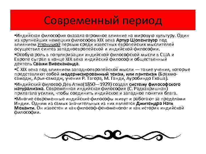 Современный период • Индийская философия оказала огромное влияние на мировую культуру. Один из крупнейших немецких философов XIX века Артур Шопенгауэр под влиянием Упанишад первым среди известных европейских мыслителей осуществил синтез западноевропейской и индийской философии. • Особую роль в популяризации индийской философской мысли в США и Европе сыграл в конце XIX века индийский философ и общественный деятель Свами Вивекананда. • C XIX века под влиянием западноевропейской мысли — такие учения, которые представляют собой модернизированный теизм, или пантеизм (Брахмосамадж, Арья-самадж, учения Р. Тагора, М. Ганди, Ауробиндо Гхоша). • Индийский философ Дев Атма(1850— 1929) создал систему философского натурализма. Современная индийская философия (С. Радхакришнан) прилагала усилия, чтобы соединить индийское и западное понятия блага. • Многие современные индийские философы живут и работают за пределами Индии. Одним из самых значительных из них является Джитендра Натх Моханти. Он известен и как философ-феноменолог и как историк индийской философии.