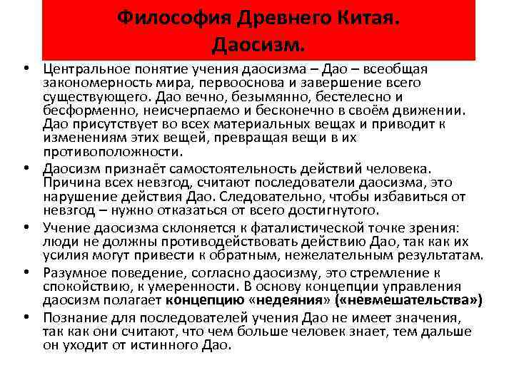 Философия Древнего Китая. Даосизм. • Центральное понятие учения даосизма – Дао – всеобщая закономерность мира, первооснова и завершение всего существующего. Дао вечно, безымянно, бестелесно и бесформенно, неисчерпаемо и бесконечно в своём движении. Дао присутствует во всех материальных вещах и приводит к изменениям этих вещей, превращая вещи в их противоположности. • Даосизм признаёт самостоятельность действий человека. Причина всех невзгод, считают последователи даосизма, это нарушение действия Дао. Следовательно, чтобы избавиться от невзгод – нужно отказаться от всего достигнутого. • Учение даосизма склоняется к фаталистической точке зрения: люди не должны противодействовать действию Дао, так как их усилия могут привести к обратным, нежелательным результатам. • Разумное поведение, согласно даосизму, это стремление к спокойствию, к умеренности. В основу концепции управления даосизм полагает концепцию «недеяния» ( «невмешательства» ) • Познание для последователей учения Дао не имеет значения, так как они считают, что чем больше человек знает, тем дальше он уходит от истинного Дао.