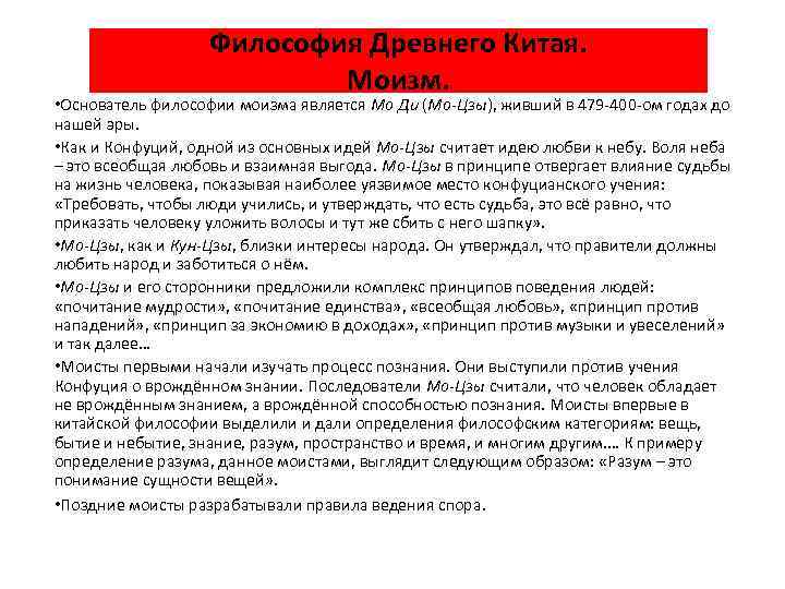 Философия Древнего Китая. Моизм. • Основатель философии моизма является Мо Ди (Мо-Цзы), живший в 479 -400 -ом годах до нашей эры. • Как и Конфуций, одной из основных идей Мо-Цзы считает идею любви к небу. Воля неба – это всеобщая любовь и взаимная выгода. Мо-Цзы в принципе отвергает влияние судьбы на жизнь человека, показывая наиболее уязвимое место конфуцианского учения: «Требовать, чтобы люди учились, и утверждать, что есть судьба, это всё равно, что приказать человеку уложить волосы и тут же сбить с него шапку» . • Мо-Цзы, как и Кун-Цзы, близки интересы народа. Он утверждал, что правители должны любить народ и заботиться о нём. • Мо-Цзы и его сторонники предложили комплекс принципов поведения людей: «почитание мудрости» , «почитание единства» , «всеобщая любовь» , «принцип против нападений» , «принцип за экономию в доходах» , «принцип против музыки и увеселений» и так далее… • Моисты первыми начали изучать процесс познания. Они выступили против учения Конфуция о врождённом знании. Последователи Мо-Цзы считали, что человек обладает не врождённым знанием, а врождённой способностью познания. Моисты впервые в китайской философии выделили и дали определения философским категориям: вещь, бытие и небытие, знание, разум, пространство и время, и многим другим. … К примеру определение разума, данное моистами, выглядит следующим образом: «Разум – это понимание сущности вещей» . • Поздние моисты разрабатывали правила ведения спора.