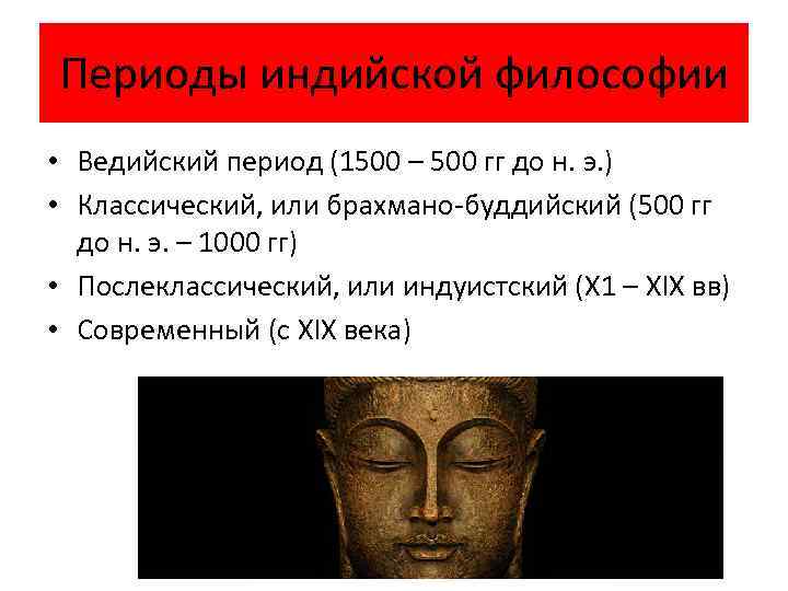 Периоды индийской философии • Ведийский период (1500 – 500 гг до н. э. ) • Классический, или брахмано-буддийский (500 гг до н. э. – 1000 гг) • Послеклассический, или индуистский (X 1 – XIX вв) • Современный (с XIX века)
